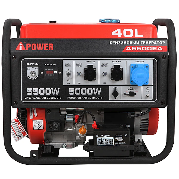 На передней панели A-iPower A5500EA расположены 2 евророзетки для подключения нетребовательных потребителей, а также силовая розетка 32А/230В, которая позволяет снять полную мощность с одного вывода. Все розетки оборудованы защитной автоматикой, которая отключает их в случае перегрузки.