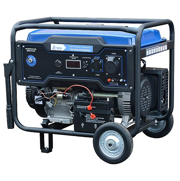 Бензиновый генератор TSS SGG 5000EHNA - 5-киловаттная электростанция в расширенной комплектации. Эта модель гораздо более универсальна, чем базовая, что позволяет одинаково эффективно применять ее как при стационарном размещении в роли резервного источника энергии, так и для выездных работ, когда во главу угла ставится мобильность.