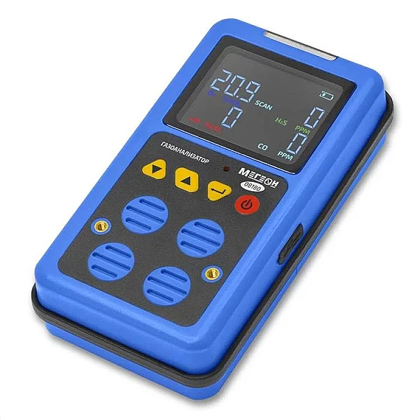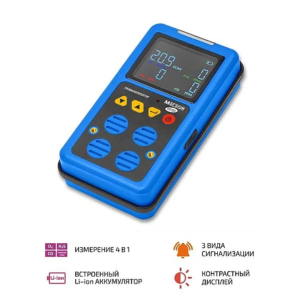 Газоанализатор МЕГЕОН 08180 – комбинированный ручной инструмент непрерывного действия, который применяется для одновременного анализа насыщенности кислорода и выявления наличия сероводорода, угарного и горючих газов в воздушном пространстве. Устройство состоит из пластикового корпуса, в который установлены детекторы обнаружения. Внутренний микропроцессор координирует процессы замеров и конвертирует импульсы сенсоров в данные на экране. Три вида сигнализирования: визуальный, звуковой и вибрационный. Два порога срабатывания тревожного сигнала.