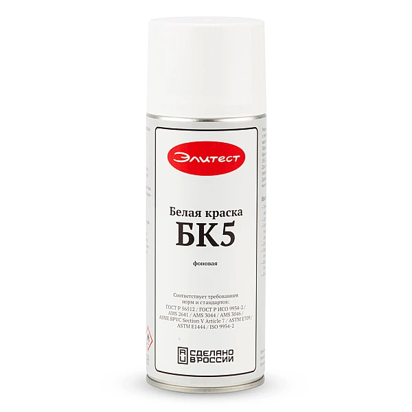 Белая фоновая (грунтовочная) краска Элитест БК5 применяется при проведении магнитопорошкового контроля изделий с темной поверхностью. Краска создает белый контрастный фон, на который затем наносится черная магнитная суспензия. Использование краски облегчает обнаружение мелких дефектов и повышает информативность контроля.