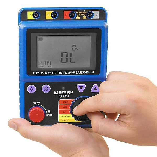 Портативный цифровой прибор МЕГЕОН 13121 предназначен для измерения сопротивления и напряжения заземляющего устройства. Применяется в промышленной и строительной областях, а также в домашнем хозяйстве. Вычисления производятся по двух- и трехпроводной схемам в диапазоне до 200 Ом. Все измерительные провода и электроды поставляются в комплекте. Изделие имеет возможность проводить непрерывные исследования, а также замеры по таймеру, который можно настроить соответствующей клавишей.