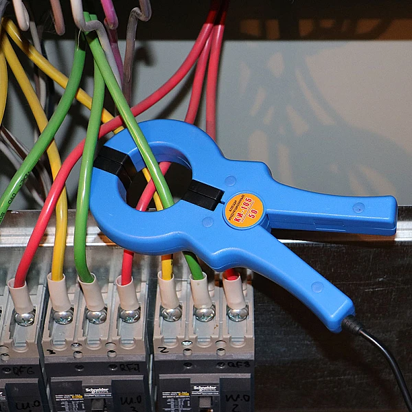 • Обхватить до смыкания полуколец индукционными клещами кабель.