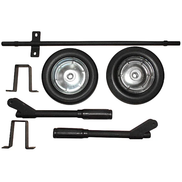 Колесная ось фиксируется снизу на передней поперечной перемычке рамы с помощью прижимных скоб, а опоры прикручиваются к задней поперечине с помощью болтов и гаек, включенных в состав комплекта. Колеса на основе штампованных металлических дисков отличаются высокой прочностью, позволяя перекатывать бензогенератор не только по любым дорогам, но и по плотному грунту. Литые шины круглого профиля диаметром 150 мм и шириной 30 мм обладают улучшенными амортизирующими свойствами. Подвижное соединение ручек позволяет складывать их при хранении бензоагрегата и в процессе его работы для уменьшения общих габаритов.