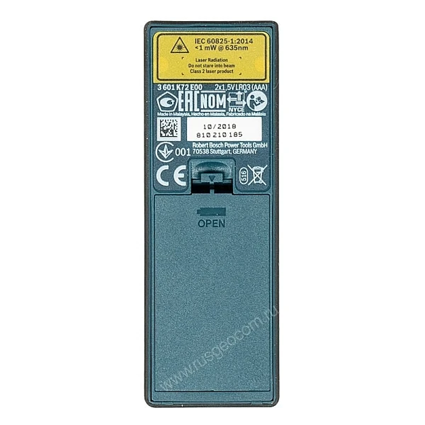 Дальномер работает от двух батарей напряжением 1,5 В типа ААА. Одного заряда элементов питания хватает на 5 часов непрерывной работы, либо на 5 тыс. единичных измерений. Для экономии заряда батареек предусмотрено автоотключение прибора после 5 минут бездействия.