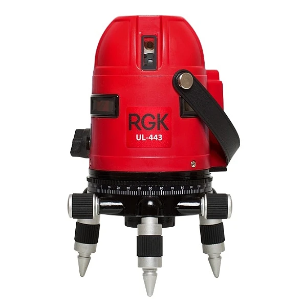 Отличительной особенностью лазерного нивелира RGK UL-443 является угол развертки в горизонтальной плоскости 360°. Прибор строит одну горизонтальную и четыре вертикальные плоскости, имеется возможность включения всех плоскостей одновременно или поочередно.