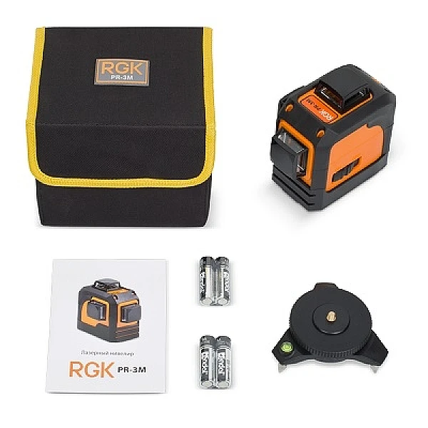 Питание лазерного уровня RGK PR-3M обеспечивается четырьмя стандартными батареями типа АА на 1.5 В. Вы также можете использовать литий-ионные аккумуляторы аналогичного вида в качестве альтернативы. Время автономной работы прибора при трех включенных лазерных лучах составляет 5 часов.