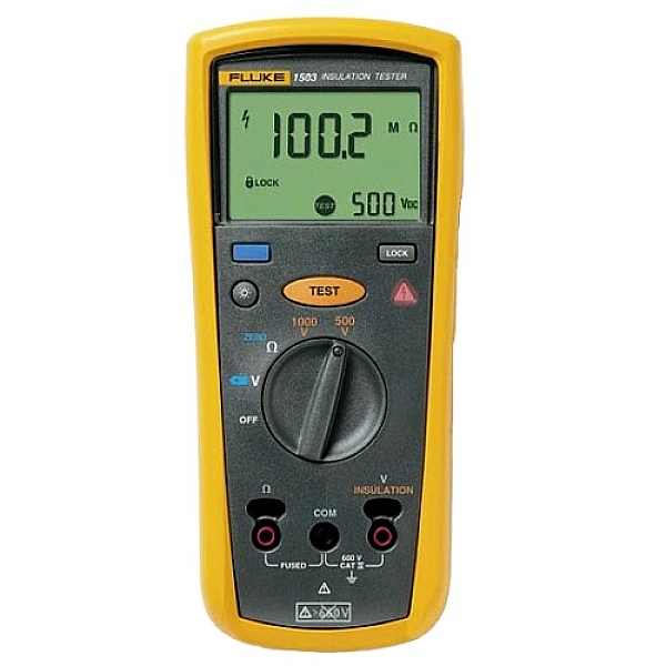 Fluke 1503 – портативный мегаомметр, предназначенный, в первую очередь, для тестирования изоляционных свойств электрооборудования и кабельной продукции, но может использоваться и как вольтметр, и в качестве измерителя низкоомных сопротивлений электрической цепи. Устройство идеально подходит для быстрого и точного поиска неисправностей, проведения пуско-наладки электрооборудования и его профилактического обслуживания.