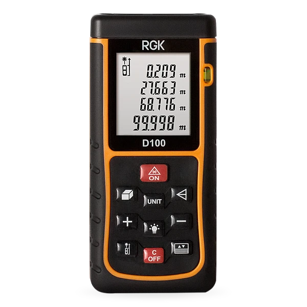 Дальномер RGK D100 оснащен мощным лазером, который позволяет измерять расстояния на удалении до 100 метров с двухмиллиметровой точностью, что позволяет работать не только в помещениях, но и на улице. Отличительной особенностью дальномера rgk D100 является наличие яркого лазерного маркера, облегчающего наведение на цель.