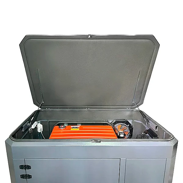 Крышка кожуха легко открывается одной рукой, надежно фиксируется и позволяет безопасно обслуживать генератор.
