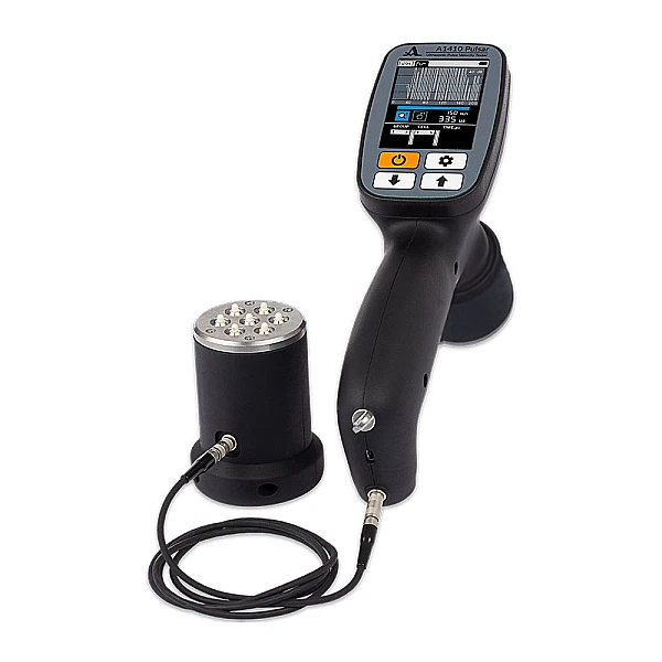 В корпус ультразвукового тестера A1410 Pulsar встроен семиэлементный преобразователь с сухими точечным контактом (СТК), принимающий ультразвуковую волну. Излучение ультразвуковой волны осуществляется выносным семиэлементным СТК преобразователем, подключенным к корпусу прибора с помощью одинарного кабеля LEMO-LEMO.